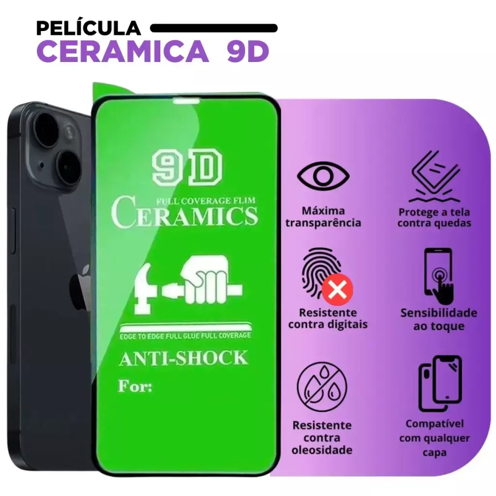 A película de cerâmica 9D para iPhone oferece resistência incomparável com acabamento elegante. Fabricada com tecnologia cerâmica avançada, protege contra riscos, impactos e manchas, mantendo a tela sempre limpa e com máxima clareza visual.